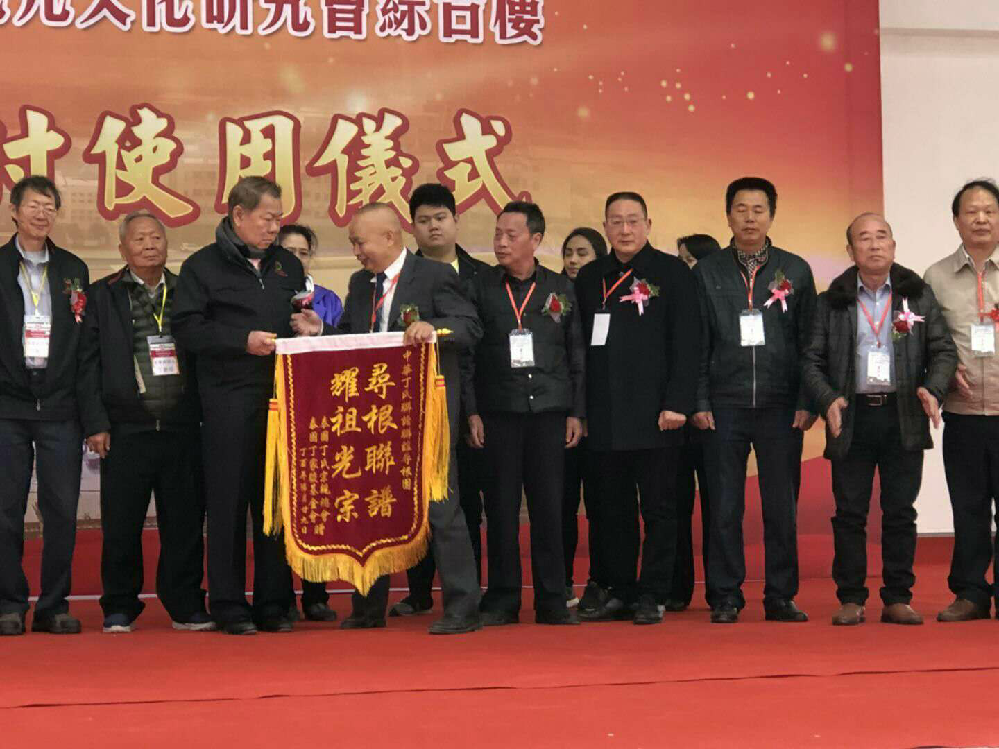 图2、泰国丁氏宗亲会丁新泰宗长(左三)向中华丁氏寻根问祖团丁冬禄团长(左五)授予荣誉锦旗。