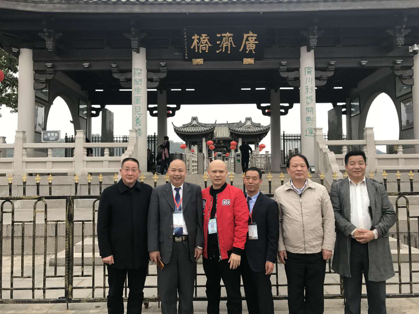 图4、中华丁氏宗亲会寻根联谱团丁冬禄团长(左二)、潮州市丁允元文化研究会常务副会长丁玉峰(右三)、安徽省蒙城县丁齐文化研究会丁钊教授(右二)、广州丁氏宗亲会丁春根宗亲(右一)、贵州丁氏宗亲会丁世强宗亲(右三)与四川省微电影艺术协会副会长、贝升建材董事长丁军(左一)在潮州广济桥(原名: