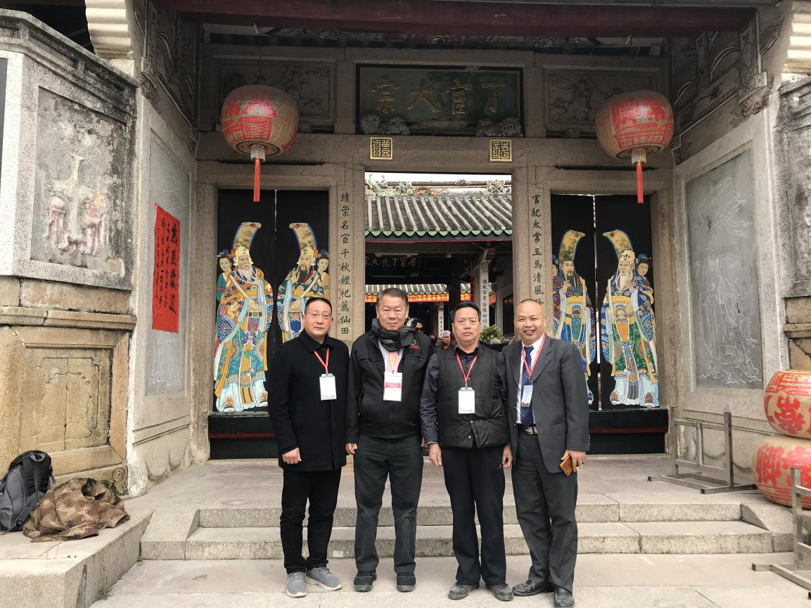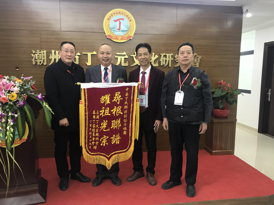 图6、泰国丁氏宗亲会第27届理事长、泰国丁家骏基金会会长丁新泰宗长(右二)、中华丁氏宗亲会联谱寻根团丁冬禄团长(右一)、重庆丁氏宗亲会丁大镛宗长(右二)、四川微电影艺术协会副会长、贝升建材董事长丁军(左一),在潮州市丁宦大宗的合影留念。