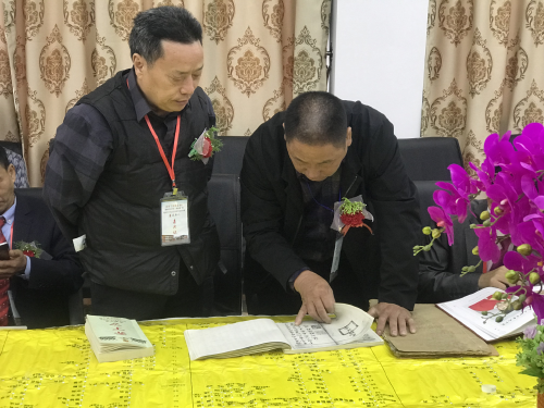 图7、重庆丁氏宗亲会丁大镛宗长(左)与中华丁氏宗亲会联谱寻根团丁经富(右)副团长,在潮州丁允元文化研究会办公大楼对接家谱。